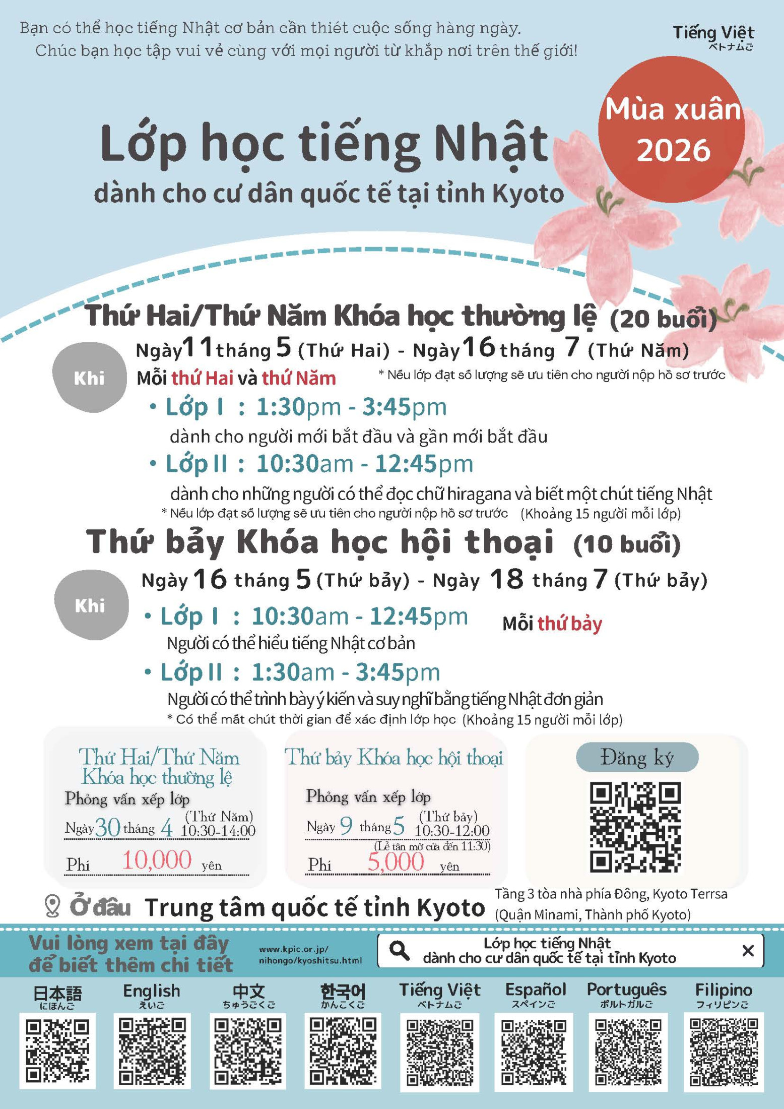 Thứ Hai/Thứ Năm Khóa học thường lệ: Lớp I/II -- 10.000 yên cho 20 buổi học