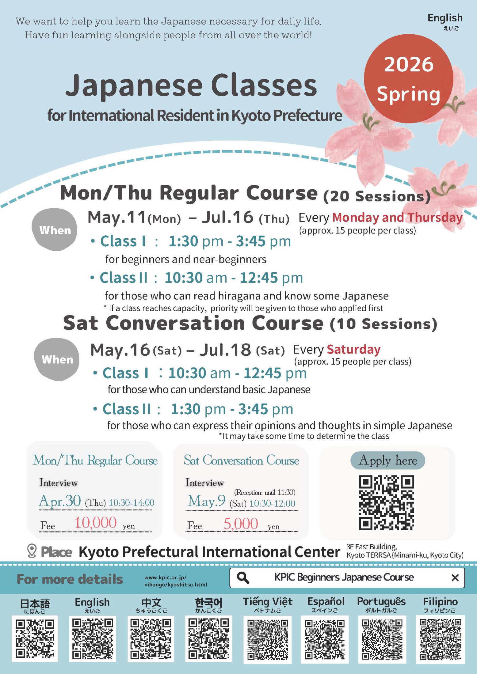 Curso Regular (Segundas/Quintas): Turmas I/II – 10.000 ienes por 20 aulas
